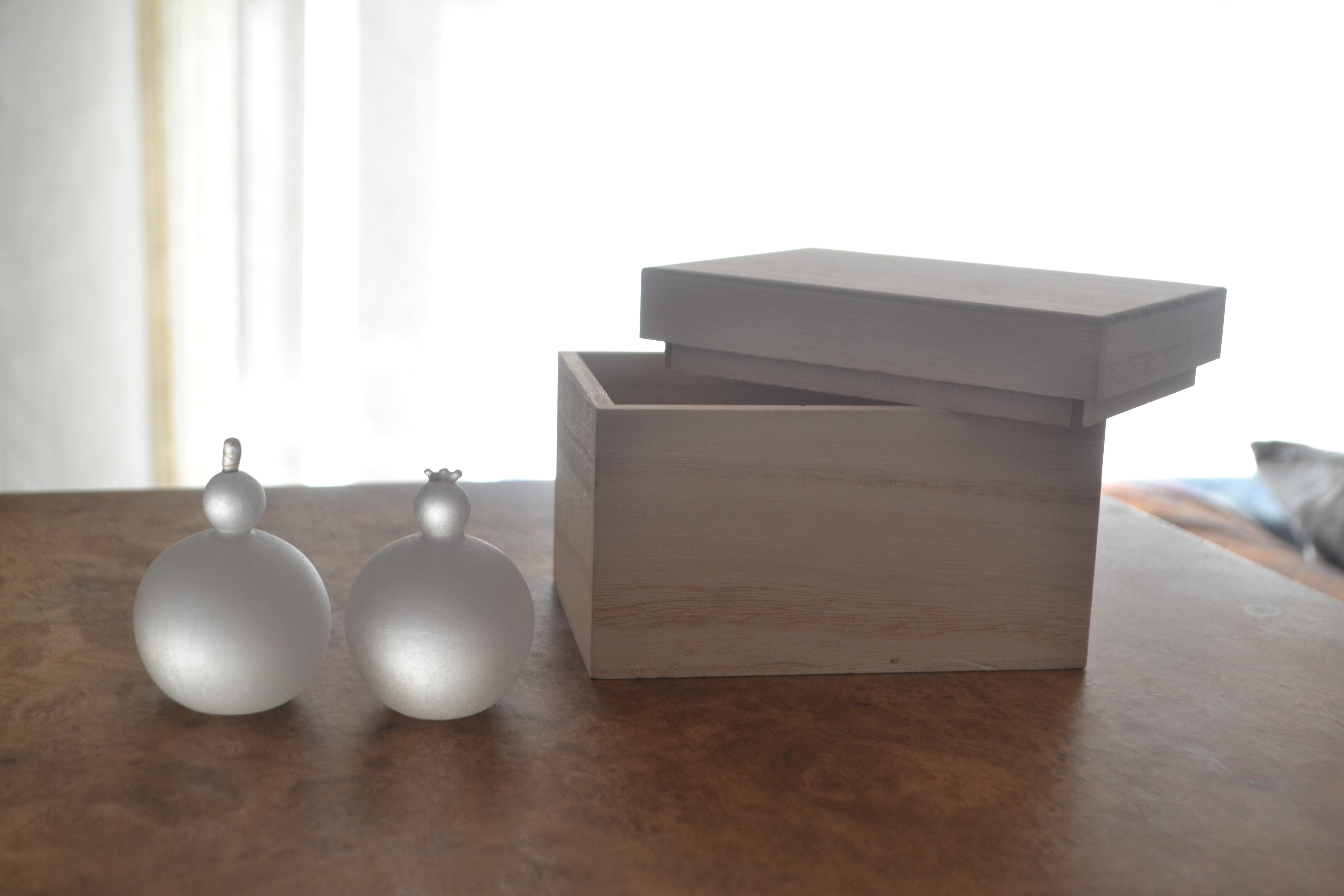 約100㎜×100㎜×140㎜の桐のお箱に入れてお送りしています。